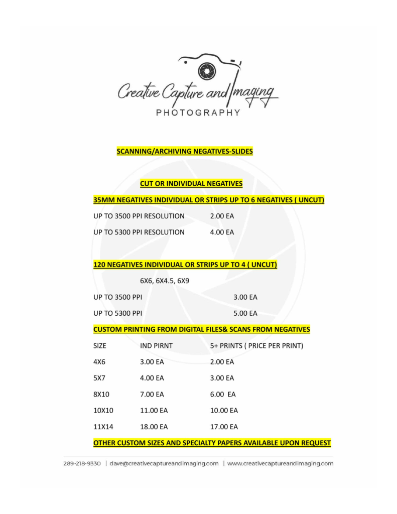 Too many of us have sleeves and sleeves and cardboard shoe boxes of uncategorized negatives with missing prints. I can scan your negatives and help you to create a digital archive for your familly, and children preserving those memories in addition to your negatives so they can enjoy and print them for generations to come. Your photos can be custom printed to any size on many grades of quality paper, from standard weights and finishes to place into albums, and picture frame, as well as printing on high quality museum quality acid free textured and fine art papers for those special photos you want preserved for a lifetime. I use papers by Hahnemuele, Moab and Canon.